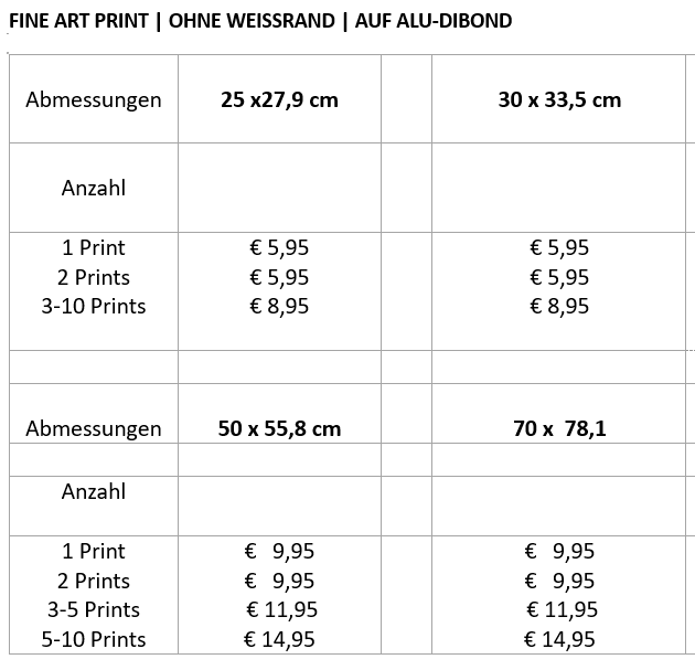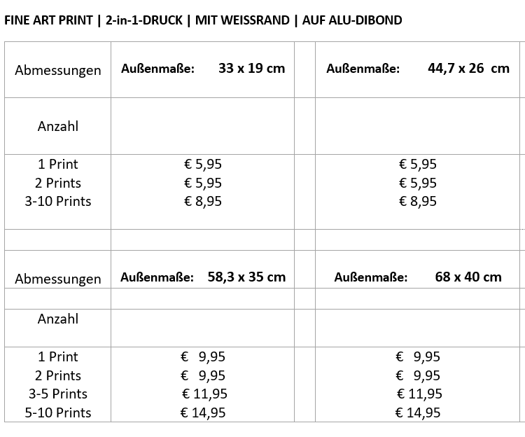 Zur Zeit werden die Fine Art Prints nur für die Lieferung in Deutschland angeboten. Das Angebot für die Lieferung ins europäische Ausland erfolgt bald.